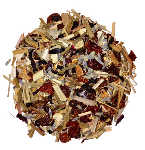 This delicious blend boasts a bold hibiscus body with a soothing lemongrass finish with soothing lavender and vanilla notes. Originally conceived of as a cool iced tea drink, Sweet Texas Dreams has quickly caught on as a comforting and warming winter herbal, as well.